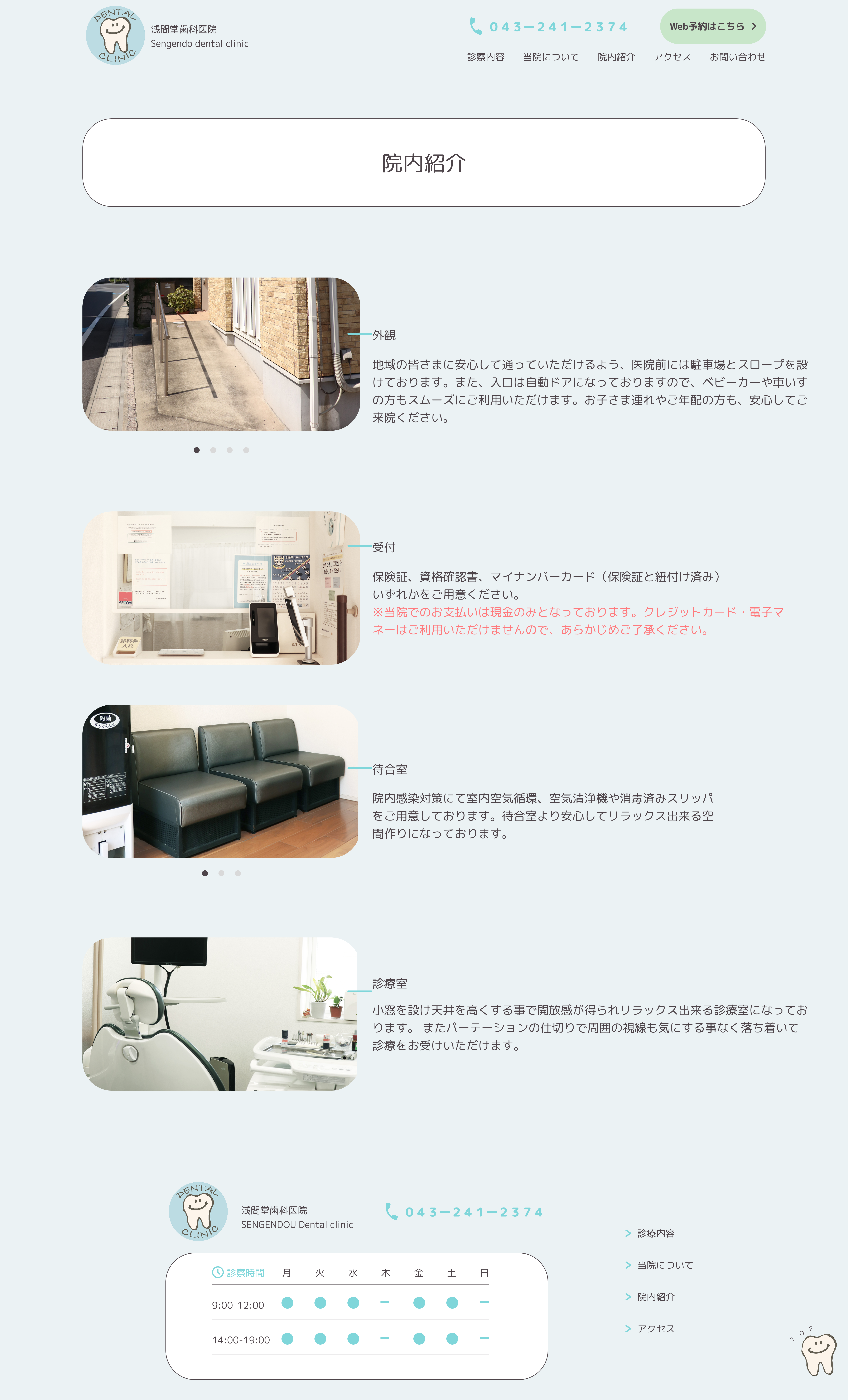 清潔感と落ち着きを表現。写真やアイコンを多用し、 初めての方にもわかりやすい情報設計を意識しました。
